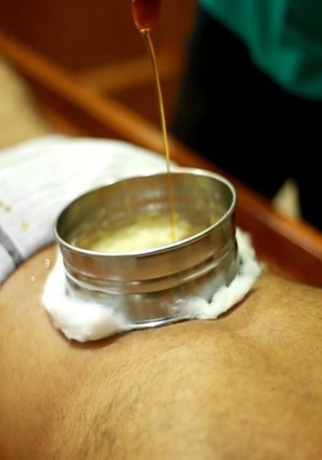 A reservoir of warm herbal oil is placed on the lower back to relieve pain and stiffness. It is effective for sciatica, lumbar spondylosis, and chronic back pain.